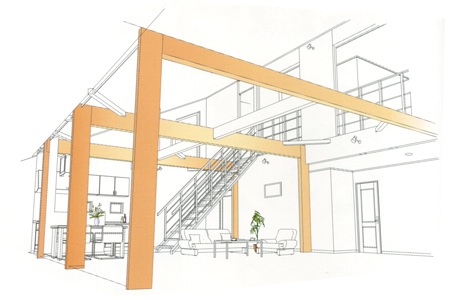 木造門型フレームは1階のみの1層フレーム、1・2階の2層フレーム、1・2・3階の3層フレームなどプランに合わせて必要なところに必要な本数だけを使用することで、自由設計の夢を拡げます。