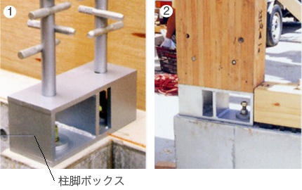 柱脚金物直後基礎アンカーボルトと縫合された柱脚ボックス部分は、強靭で信頼性の高い柱脚構造を提供し、耐力墜に代わるフレーム強度を実現しています。